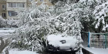 Қостанайда қарлы дауыл: ауыр қар мен жаңбырдан бірнеше көлік ағаш астында қалды