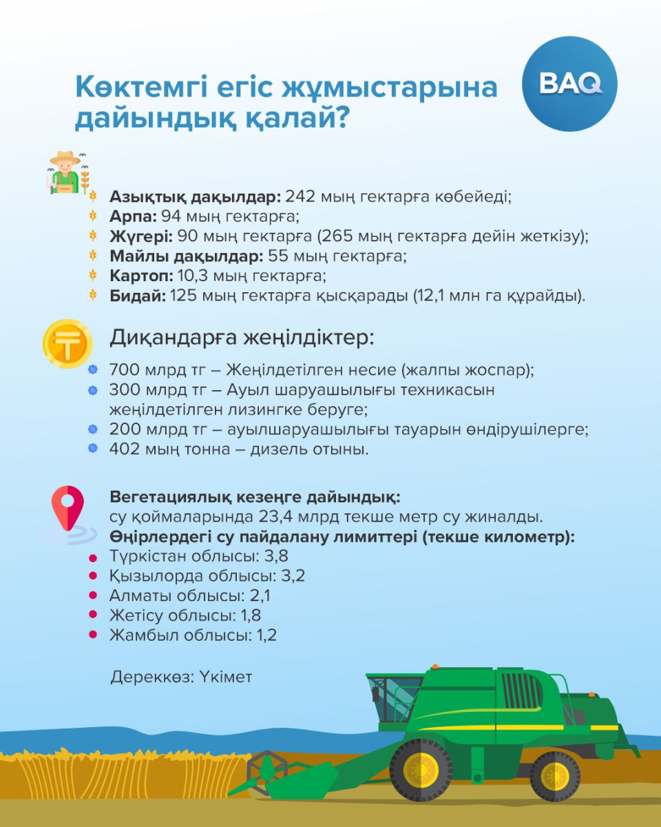Қазақстанда 2026 жылғы көктемгі егіс жұмыстарының құрылымы бекітіліп, диқандарды қаржыландыру мен ресурстармен қамтамасыз ету шаралары басталды, деп хабарлайды BAQ.KZ.